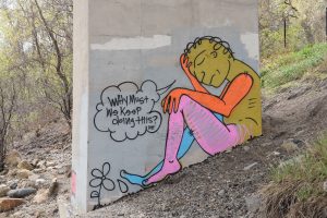 An odd, though thought provoking spray-painted piece was located on a lower abutment of the west side of the Franklin Avenue bridge in Minneapolis. (Photo by Twin Cities Almanac, Spring 2021).