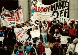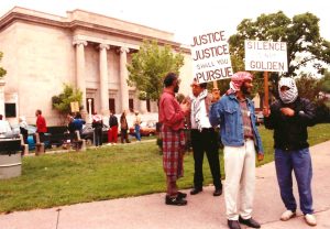 Photo: U.S. Out of El Salvador protest in front of the Federal Building, downtown, Minneapolis, 1989. (Photo by Twin Cities Almanac).