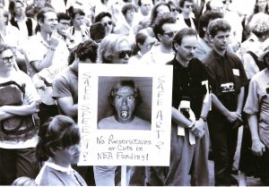 Protesting cuts to the National Endowment for the Arts (NEA). This occurred on the Nicollet Ave. side of Westminister Presbyterian Church, 1200 S Marquette Ave, Minneapolis. Several hundred people attended to demand that conservatives not eliminate the NEA as was being threatened. (Photo by Twin Cities Almanac, circa 1995).