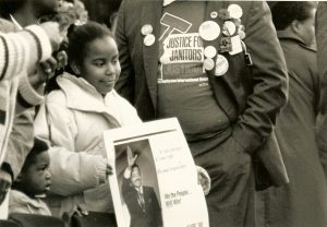 A young African American girl stands next to a ‘Justice for Janitors’ enthusiast at a gathering in front of the University’s student union as she awaited the featured speaker, Jesse Jackson. the crowd was estimated at about 2,000 people. (Photo by Twin Cities Almanac).