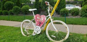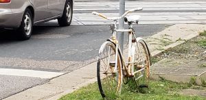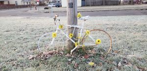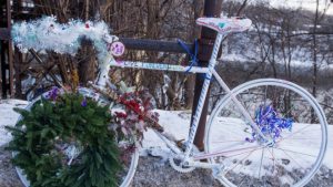 Memorial ghost bike for June Haddow located along East River Parkway near Franklin Ave. Bridge in Minneapolis. The actual memorial has been removed. (Photo courtesy of Kevin Venerus). Read More Here.