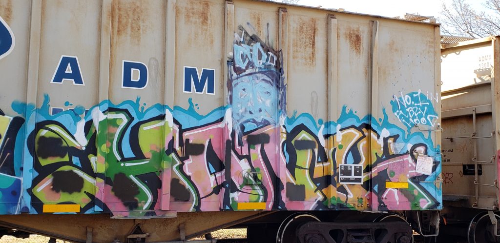 Spray paint on a rail car in the Hiawatha Milling District in Minneapolis. ADM (Supermarket to the World) stands for Archer-Daniels-Midland Company. (Photo by Twin Cities Almanac, November 2020).