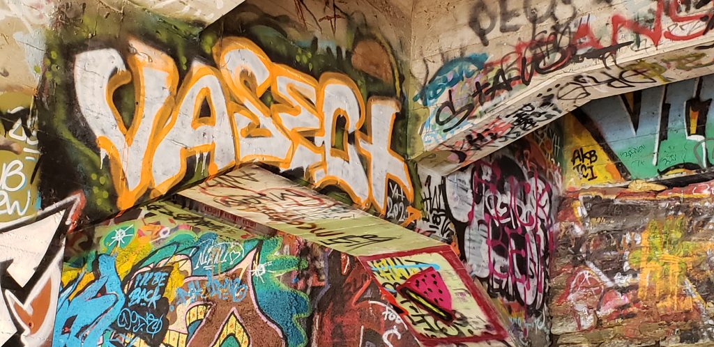 Colorful graffiti is evident under the Ford Parkway Bridge linking the Twin Cities of Minneapolis and St. Paul. Brightly painted murals cover nearly every inch and are ever-changing here, yet few people will ever see its vibrant result. The main tag in this image reads, “VACECT.” (Photo by Twin Cities Almanac, March 2021).