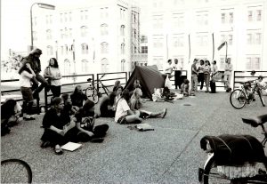 Camp-in at the University of Minnesota by students bringing attention to the plight of homeless people. Possibly located behind the Anderson Archives with art buildings in the background. (Photo by Twin Cities Almanac, circa early 1990s).
