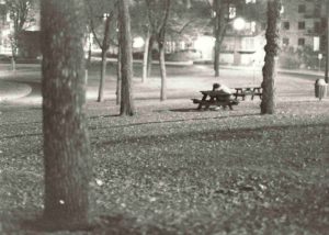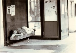 Homeless man sleeping in the late night hours on the east edge of Loring Park. (Photo by Twin Cities Almanac, circa. 1990).