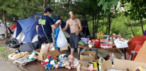 Maplewood, Minnesota homeless encampment just south of the Maplewood Library and west of Maplewood Mall. Fire department staff delivers water and ice to the makeshift food kitchen area. Only days earlier, a homeless man drowned in a nearby pond. (Photo by Twin Cities Almanac, July 2020).