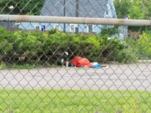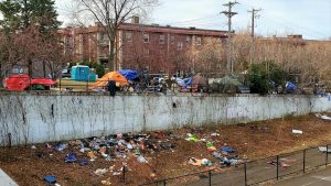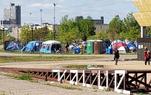 A homeless encampment at The Mall (park) in Uptown of Minneapolis. Although disarray at homeless camps are common, this one recently experienced a fire in one of the tents, a common risk as cold weather approaches. View from the Midtown Greenway looking Southwest. (Photo by Dean Amundson, November 2020).