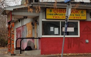 A homeless person huddles under a small blanket on the doorstep of the now burned out China Wok restaurant located at 27th Ave. S. & 28th St. E. (Photo by Twin Cities Almanac, November 2020).