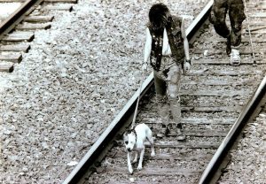 Homeless youth and their dog in the Uptown area of Minneapolis are spotted hiking along the 29th Street railroad tracks. (Photo by Twin Cities Almanac).