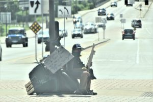 Homeless panhander on Maryland Avenue near I-35E in St. Paul.