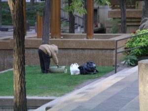 Homeless man sleeping near 46th Street East and Hiawatha Ave. S. in Minneapolis. Shelters are often viewed by homeless clients as cramped and unsafe. (Photo by Twin Cities Almanac, 2016).