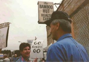 Protests in 1992 outside one of the oldest “sauna parlors” in Minneapolis, also called “health clubs.” The Bamboo Hut Health Club was located near 54th and Nicollet Ave. S. and was eventually closed down. (Photo by Twin Cities Almanac).