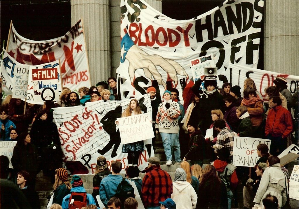 Photo: U.S. Out of El Salvador protest in front of the Federal Building, downtown, Minneapolis, 1989. It was sponsored by the Twin Cities chapter of the Committee in Solidarity with the People of El Salvador (CISPES). (Photo by Twin Cities Almanac).