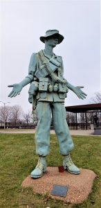 Monument to the Living, by Rodger Brodin, St. Paul, MN. Located on the south lawn of the state capitol. Inscription reads: “Why do you forget us?” Presented by and for the veterans of Minnesota dedicated May 22, 1982. Vietnam era soldier. (Photo by Twin Cities Almanac, November 2020).