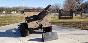 World War II artillery outside a Minneapolis Armory in Northeast. Plaque reads: “This 25lb Gun Howitzer was dedicated to the soldiers of the 34th Infantry [Red Bull] Division by the British Government in recognition of being the first Americans to engage the German Army in combat. November 19, 1942 – North Africa.” (Photo by Twin Cities Almanac, November 2020).